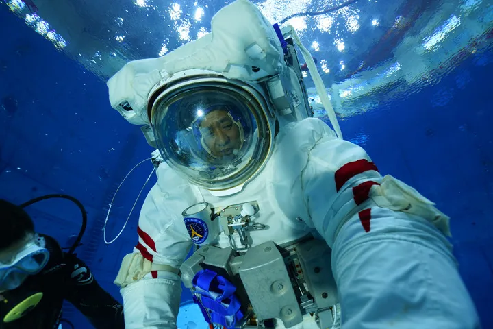1月2日,航天员聂海胜在进行空间站任务模拟失重环境水下训练。新华社发(孔方舟 摄)