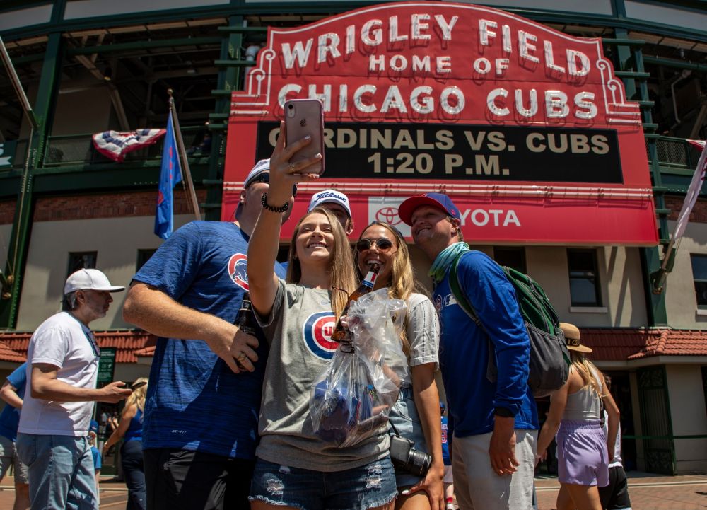 6月11日,在美国伊利诺伊州芝加哥,人们观看比赛前自拍。当天,伊利诺伊州解除疫情管制,全面开放。(新华社发,乔尔·莱纳摄)