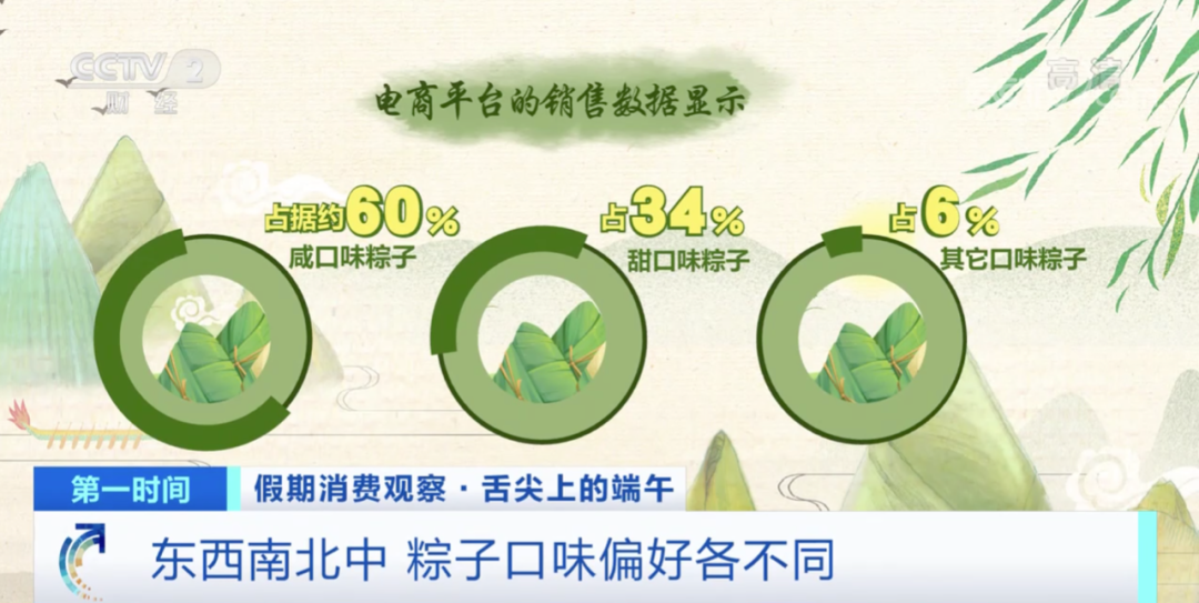 电商平台的销售数据显示,咸口味粽子占据约60%,甜口味约占34%,其它口味约占6%。东北、华北地区消费者是甜粽子的铁粉儿,而南方则是以咸口为主。