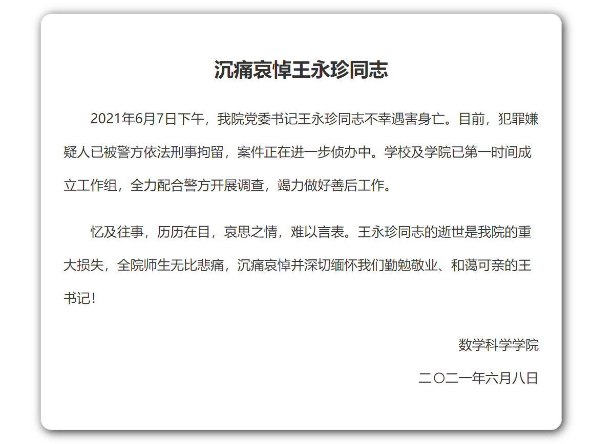 公告称,6月7日下午,王永珍不幸遇害身亡。目前,犯罪嫌疑人已被警方依法刑事拘留,案件正在进一步侦办中。复旦大学及数学科学学院已第一时间成立工作组,全力配合警方开展调查,竭力做好善后工作。一些熟悉复旦数学院的信源告诉记者,他们与王永珍长期相处甚至共事,感觉王永珍是一位非常nice的人,口碑甚好,愿逝者安息。