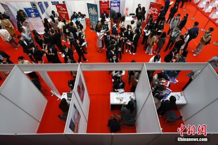 资料图:求职者在招聘会场递交简历。中新社记者 富田 摄