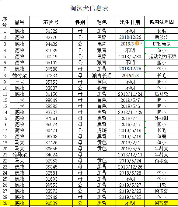 公告下方还有一个“淘汰犬信息表”附件,其中详细列举了此次出售犬只的信息(出生年月、品种、毛色等)及其淘汰原因,具体来看,品种包括德牧、马犬、德荷杂、荷马杂、史宾格等,其中以德牧居多,至于淘汰原因,有年龄大(警犬标准)、胆小、兴奋性低等等。