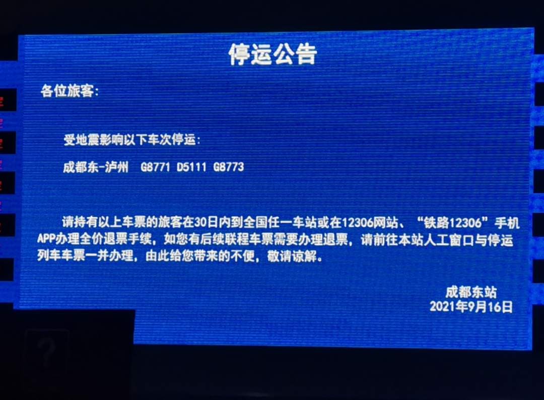 受泸县地震影响,目前绵泸高铁内江至泸州区间线路已经停封闭,各区间线路进去检查维修状态,泸州至成都最早班线已停止运行。