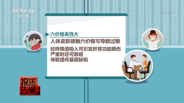 六价铬毒性大,人体皮肤接触六价铬可导致过敏;经呼吸道吸入会引发肝肾功能损伤,严重时还可致癌、导致遗传基因缺陷。