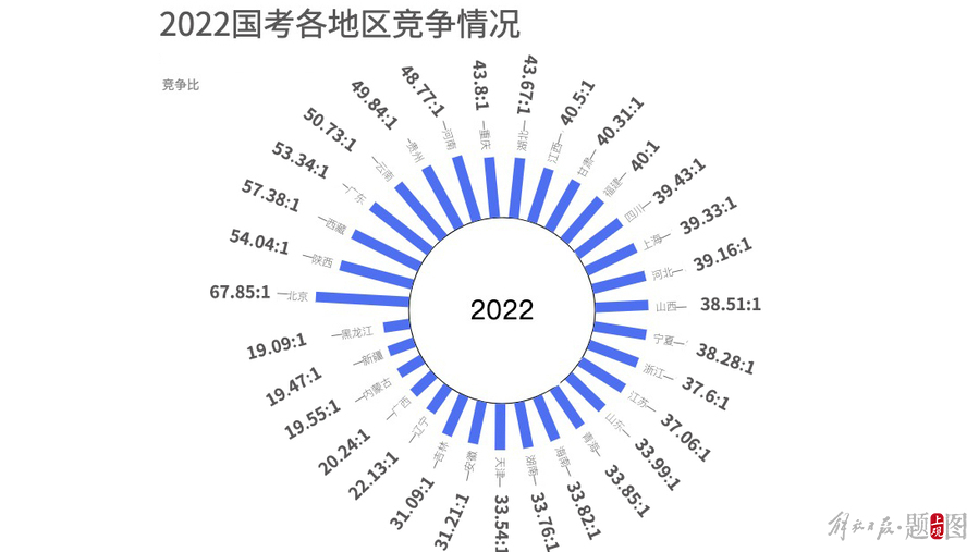 第二名与第三名则是陕西省与西藏壮族自治区,竞争比分别达到54.14:1与53.78:1,在“僧多粥少”的情况下,偏远地区成为报考热门。