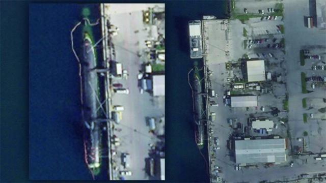 ↑卫星照片显示,“康涅狄格”号的水面部位没有明显碰撞痕迹