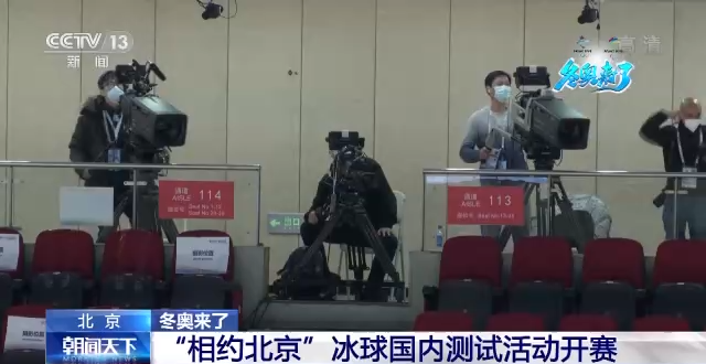 这场冰球赛是北京北汽队对阵北京首钢队,开赛不久身穿白色球衣的北京北汽队就打入了一粒漂亮的入球,而精彩的赛事转播更需要先进的摄像系统来助力,在场馆的环形屏下方吊装了多达60台相机,座席中间还有三个球形的摄像头,这就是针对2022冬奥会冰雪运动的特点研发的多维度观赛体验和VR直播技术。