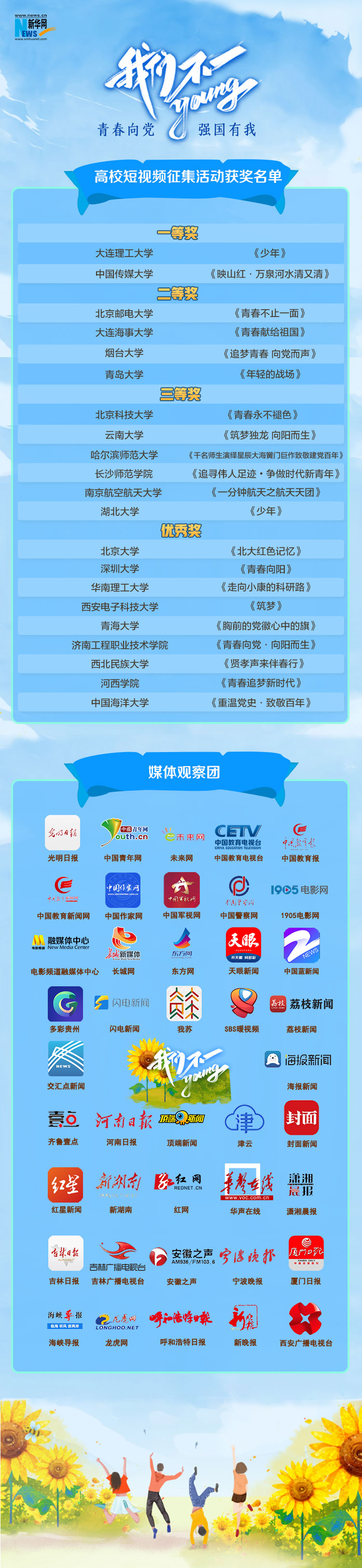 由新华网客户端主办的“我们不一young:青春向党 强国有我”高校短视频网络征集活动于11月3日正式收官。本次活动清华大学、北京大学、中国传媒大学等近百所高校参与,从近千件作品中海选精挑出50件入围作品,经大众网络投票和新华号特邀专家综合评定,大连理工大学选送作品《少年》、中国传媒大学选送作品《映山红·万泉河水清又清》等21件作品获奖。