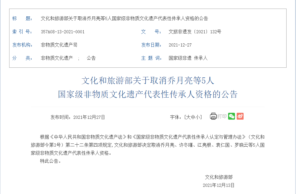 据文旅部网站消息,根据《中华人民共和国非物质文化遗产法》和《国家级非物质文化遗产代表性传承人认定与管理办法》(文化和旅游部令第3号)第二十二条第四项规定,文化和旅游部决定取消乔月亮、许冬瑾、江亮根、袁仁国、罗晓云等5人国家级非物质文化遗产代表性传承人资格。