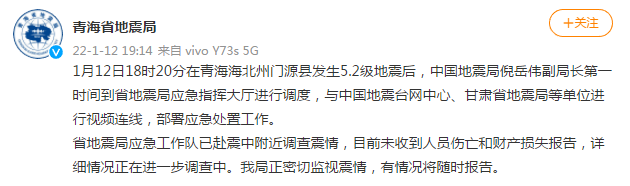 另据@青海省地震局 消息,1月12日18时20分在青海海北州门源县发生5.2级地震后,中国地震局倪岳伟副局长第一时间到省地震局应急指挥大厅进行调度,与中国地震台网中心、甘肃省地震局等单位进行视频连线,部署应急处置工作。