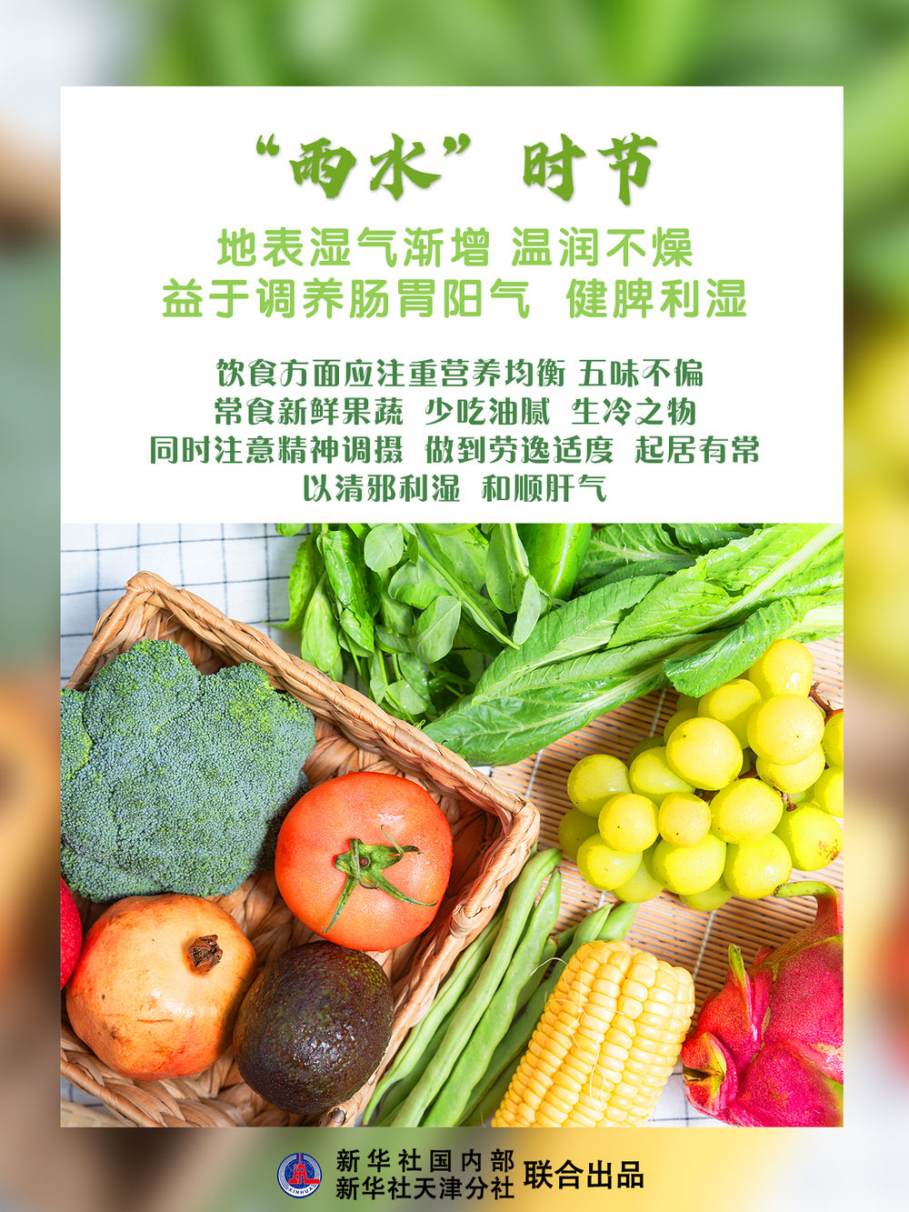 “雨水”时节,地表湿气渐增,温润不燥,益于调养肠胃阳气,健脾利湿。饮食方面应注重营养均衡,五味不偏,常食新鲜果蔬,少吃油腻、生冷之物,同时注意精神调摄,做到劳逸适度,起居有常,以清邪利湿,和顺肝气。