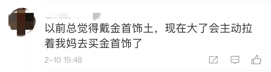 一些老字号也越来越懂年轻人,放低身段不再死抱“十二生肖”“转运珠”等传统造型,有些推出了迪士尼旗下IP、哆啦A梦、小黄人、孙悟空等形象的联名款,有些玩起了“护身虎”“暴发虎”“萌(猛)虎”等谐音梗。无论是自用还是送人,让年轻消费者有了“拿得出手”的感觉。从当年的“惊吓”,到现在的“惊喜”,越来越多的年轻人加入“买金”大军,也就不奇怪了。
