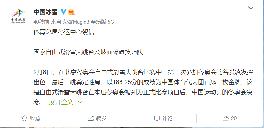 2月8日,在北京冬奥会自由式滑雪大跳台比赛中,第一次参加冬奥会的谷爱凌发挥出色,最后一跳奠定胜局,以188.25分的成绩为中国体育代表团再添一枚金牌,这是自由式滑雪大跳台在本届冬奥会被列为正式比赛项目后,中国运动员的冬奥会决赛首秀。首秀夺金,未来可期!