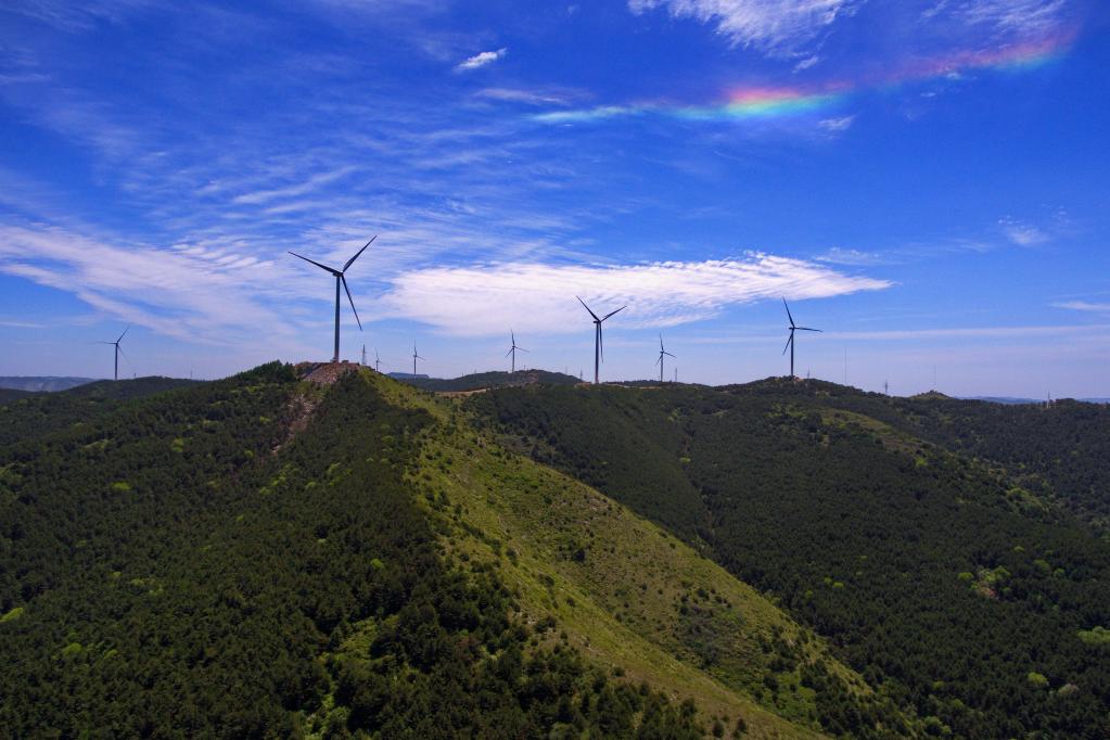 2018年5月23日拍摄的壶关县常家池村附近山上的风力发电机。新华社记者曹阳 摄