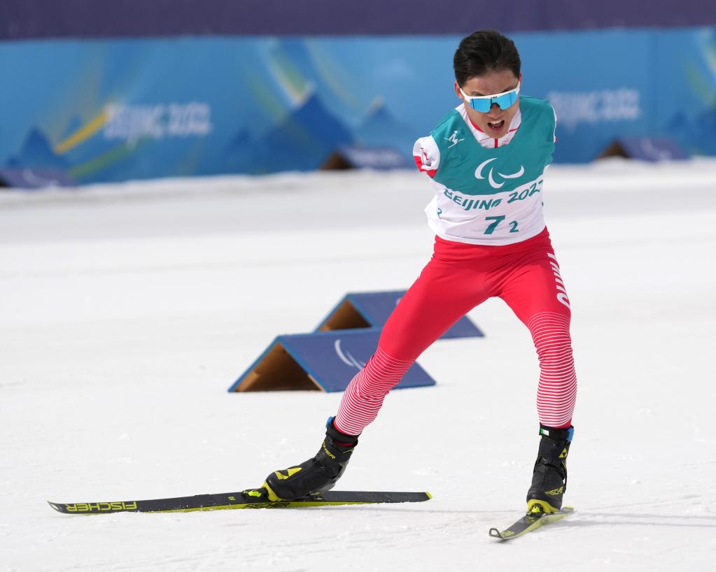 3月13日,中国队选手王晨阳在北京冬残奥会残奥越野滑雪混合接力4×2.5公里比赛中。新华社记者 万象 摄