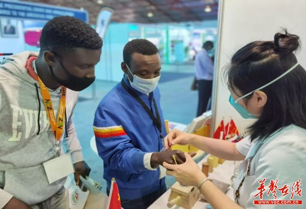 在津巴布韦国际贸易展中,当地民众在展台前体验中医针灸。王小菊 摄
