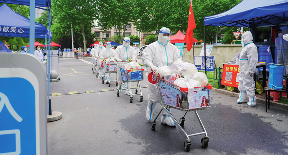 2022 年 4 月 30 日, 合肥市滨湖世纪社区和园小区,社区物资配送人员正在为居民配送生活必需品 孔连连摄