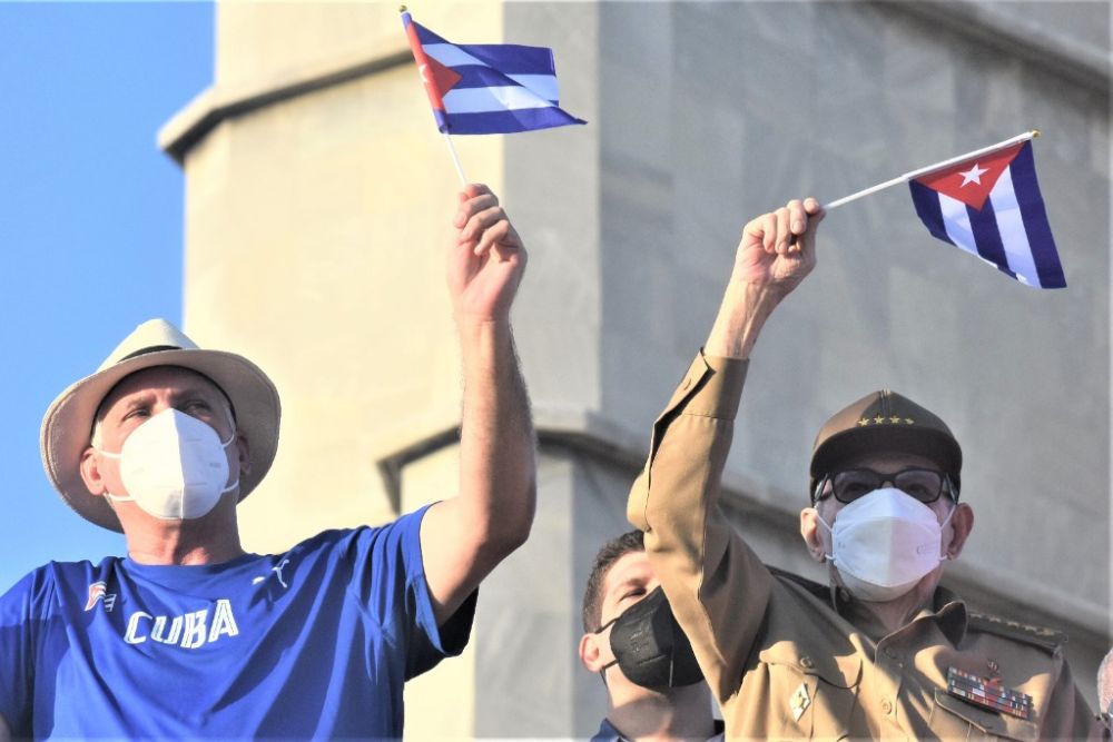 5月1日,古巴革命领袖劳尔·卡斯特罗(右)与古巴共产党中央委员会第一书记、古巴国家主席迪亚斯-卡内尔在哈瓦那革命广场参加“五一”国际劳动节集会游行。新华社记者朱婉君摄