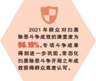 “2021年全国群众安全感为98.62%,近5年持续保持高位”;“2018年起为期3年的扫黑除恶专项斗争,全国共打掉涉黑组织3644个、涉恶犯罪集团11675个”;“2021年,全国公安机关共破获电信网络诈骗案件44.1万余起,追缴返还人民群众被骗资金120亿元”……