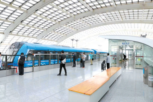 新落成的两座乘客候车大厅总占地面积276平方米,整体采用钢结构设计,后墙和亭顶以流线型骨架铝单板覆盖,与航站楼顶棚遥相呼应,优雅美观。三面玻璃幕墙视野清晰,便于乘客在候车时观察站台及列车动态。室内安装空调新风系统和智能灯具,温度和亮度可由工作人员根据现场实际情况通过手机终端动态调节,给乘客带来舒适、温馨的候车体验。