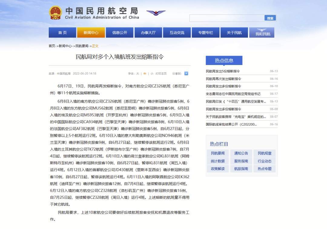 6月17日、19日,民航局再发熔断指令,对南方航空公司CZ326航班(悉尼至广州)等11个航班实施熔断措施。