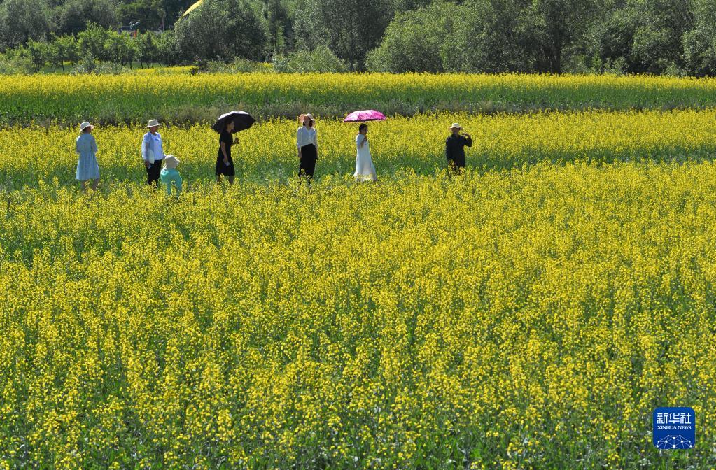 6月14日,在甘肃省积石山保安族东乡族撒拉族自治县寨子沟乡的油菜花田里,游客在赏花观景。