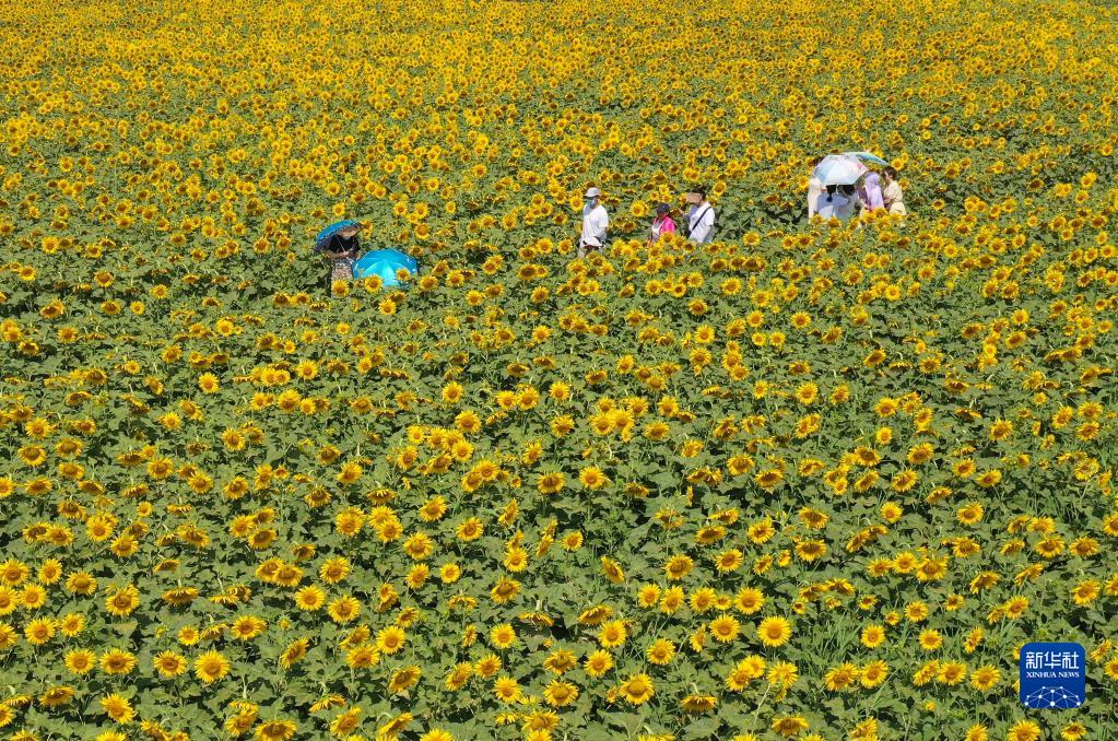 6月14日,游客在安徽省淮北市相山区渠沟镇张楼村油葵种植基地赏花游玩(无人机照片)。