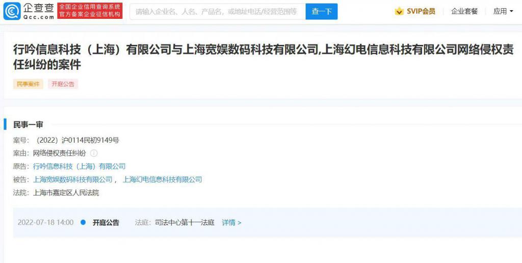 企查查 APP 显示,近日,小红书关联公司行吟信息科技(上海)有限公司与 B 站关联公司上海幻电信息科技有限公司、上海宽娱数码科技有限公司网络侵权责任纠纷新增开庭公告,原告为行吟信息科技(上海)有限公司,案件将于 7 月 18 日在上海市嘉定区人民法院开庭。