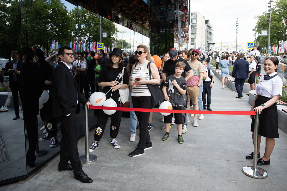 ↑6月12日,人们在俄罗斯首都莫斯科普希金广场的“只有美味”连锁餐厅外排队等待用餐。