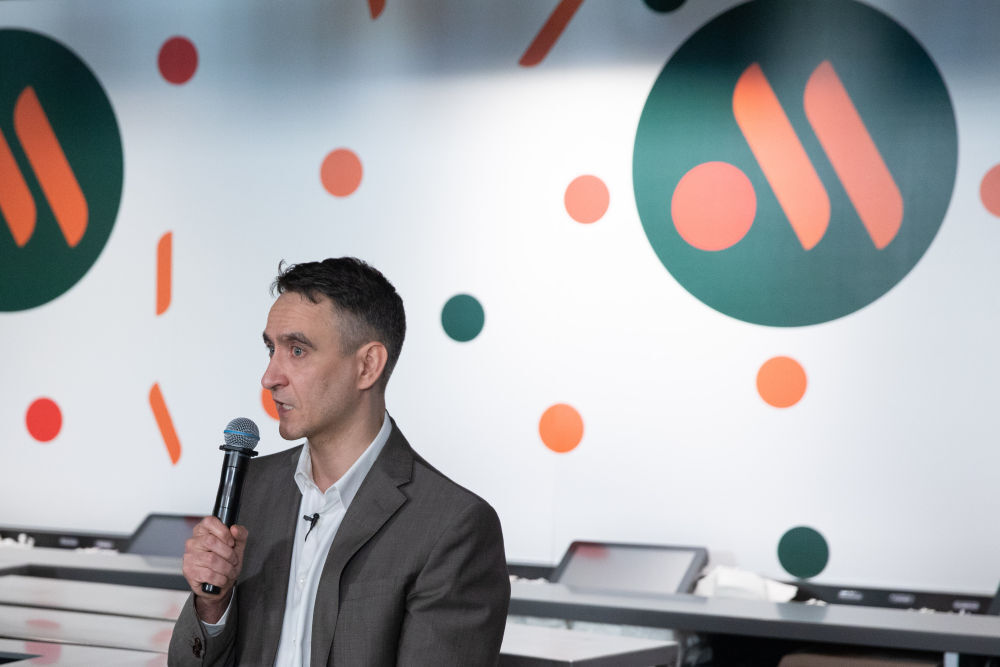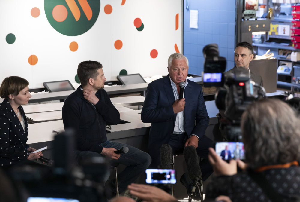 ↑6月12日,在俄罗斯首都莫斯科普希金广场的“只有美味”连锁餐厅,“只有美味”连锁餐厅的总经理奥列格·帕罗耶夫回答记者提问。