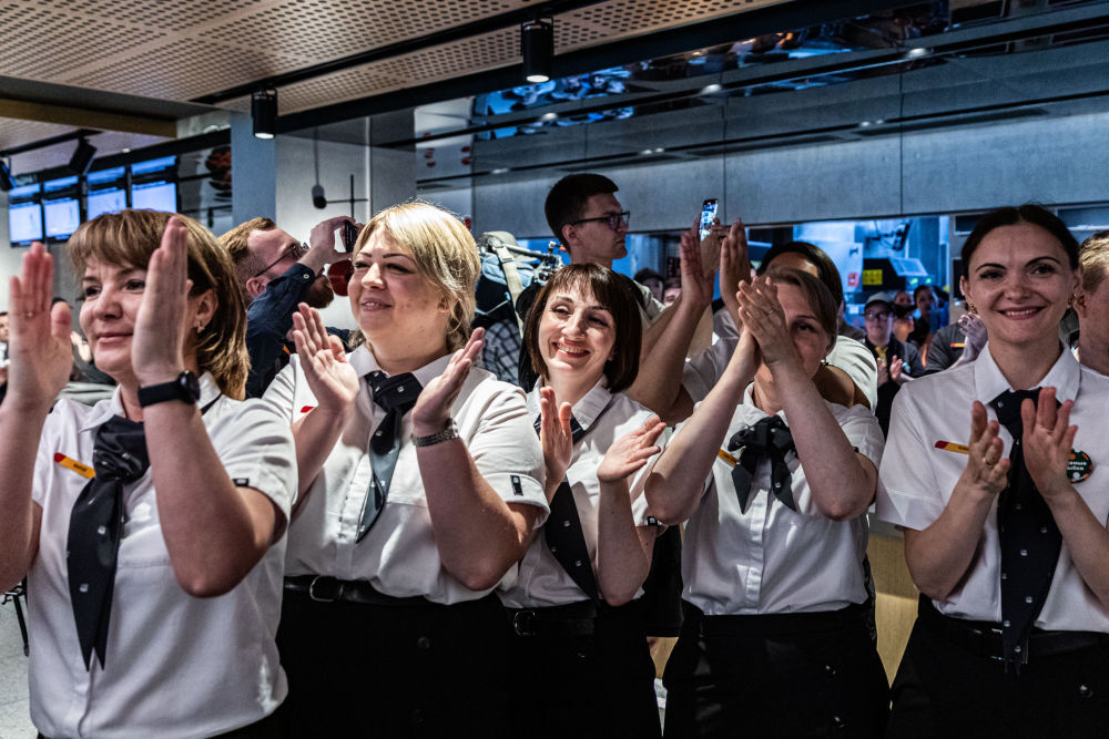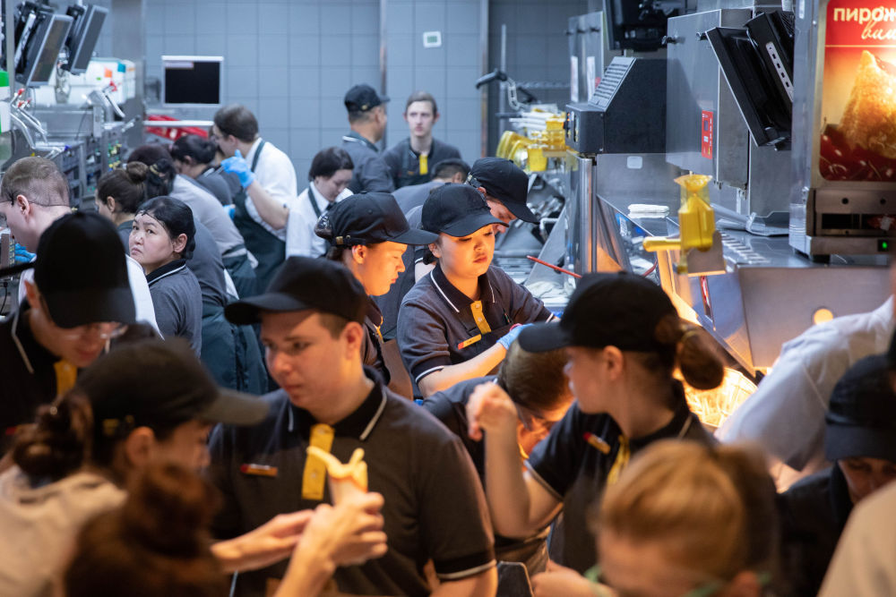 ↑6月12日,工作人员在俄罗斯首都莫斯科普希金广场的“只有美味”连锁餐厅庆祝开业。