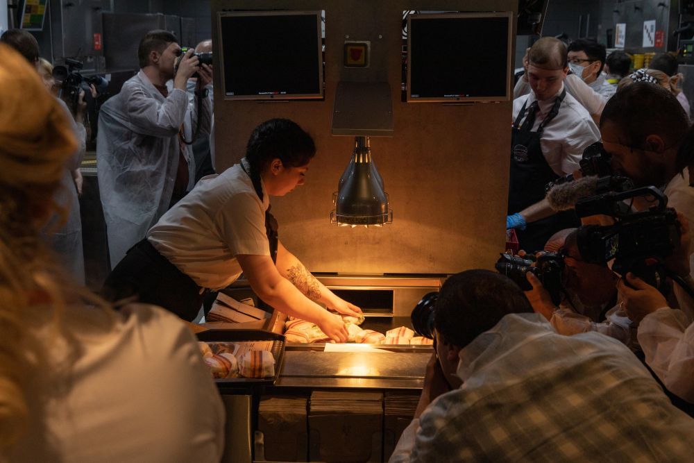 ↑6月12日,在俄罗斯首都莫斯科普希金广场的“只有美味”连锁餐厅,媒体记者拍摄制作完成的套餐。