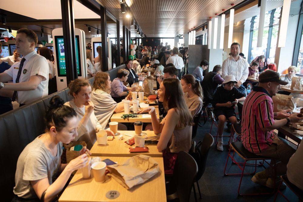 ↑6月12日,顾客在俄罗斯首都莫斯科普希金广场的“只有美味”连锁餐厅用餐。