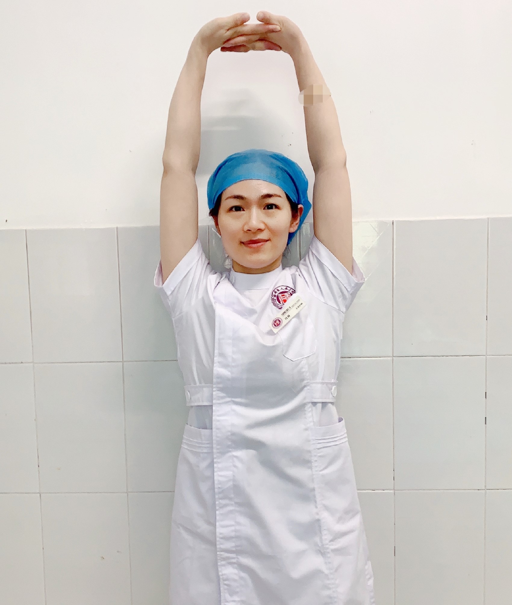 二是夹脊法。双手十指相扣置于头顶部,双手肘部向后展开,坚持5组,每组坚持15秒。