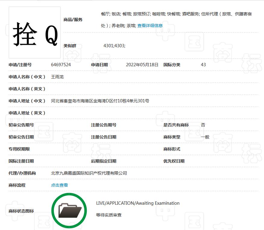 中新财经6月8日电 国家知识产权局商标局网站查询结果显示,近日,自然人王某申请注册“拴Q”商标,国际分类为餐饮住宿等,当前状态为“等待实质审查”。