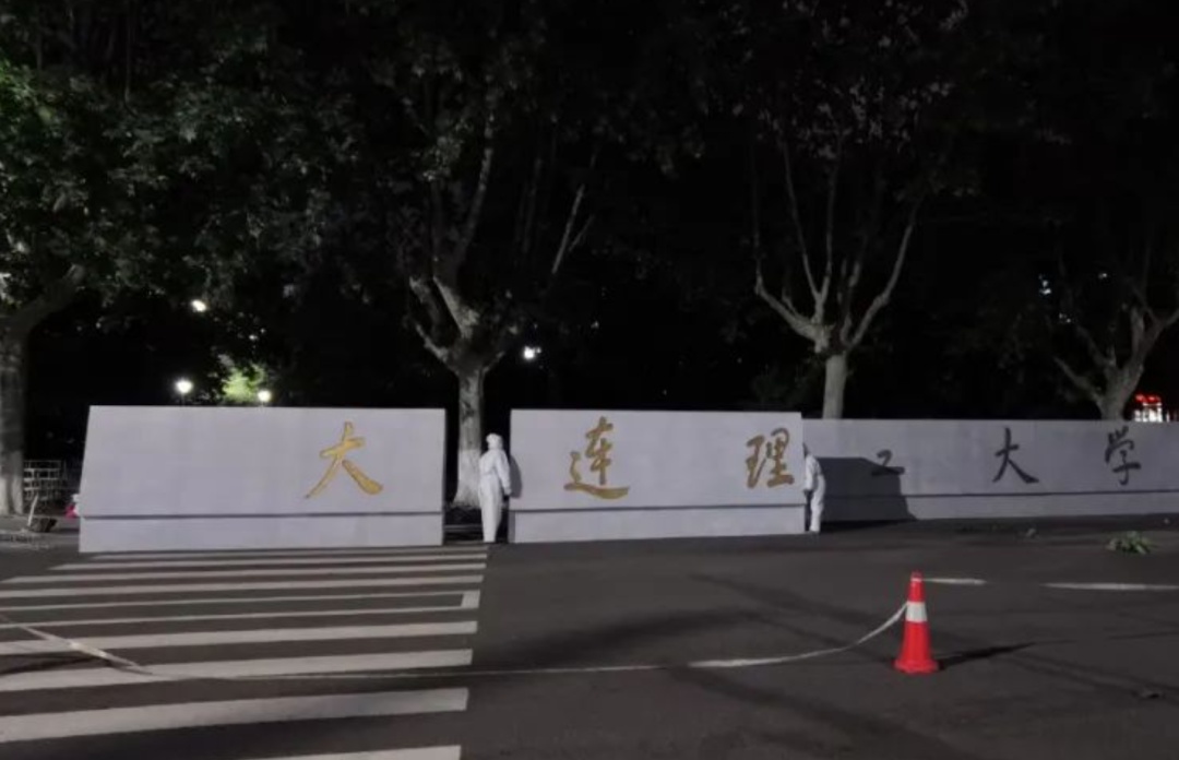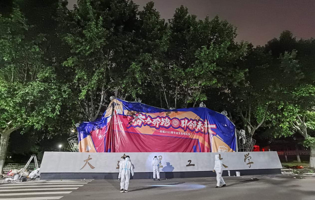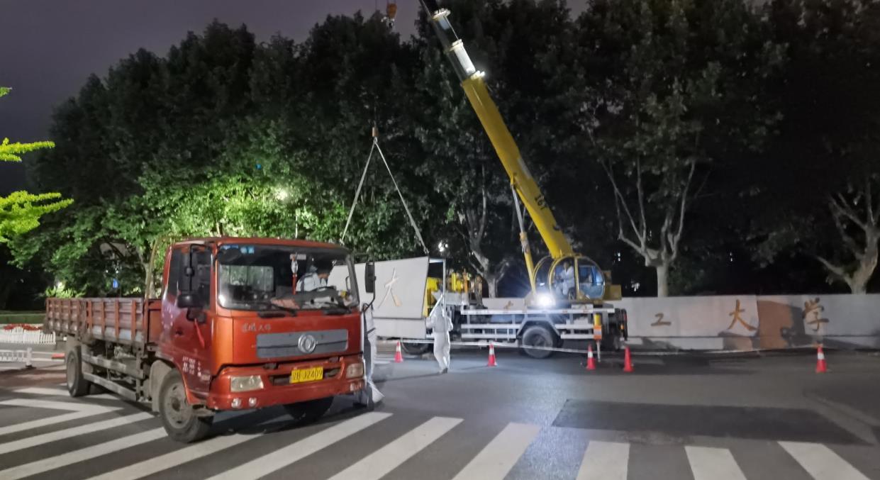 大连理工的老师们冒雨连夜施工,用了一个通宵,把复制的校门组装完毕。“新校门”全长20.4米,按照实物1:1全尺寸制作,采用表面真石漆喷涂+阴刻模拟石材,质感与真实校门完全相同。