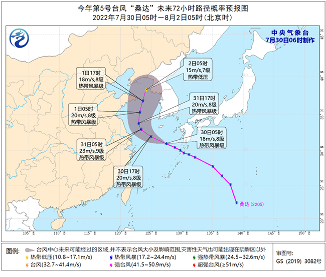 受“桑达”影响,7月30日至31日,东海北部、黄海中部和南部、长江口区、浙江东北部沿海、上海沿海、江苏南部沿海将有6~7级风,“桑达”中心经过的附近海面风力有8~9级,阵风可达10级。7月30日至31日,江苏南部沿海、浙江北部沿海、上海地区将有中到大雨,局地暴雨。