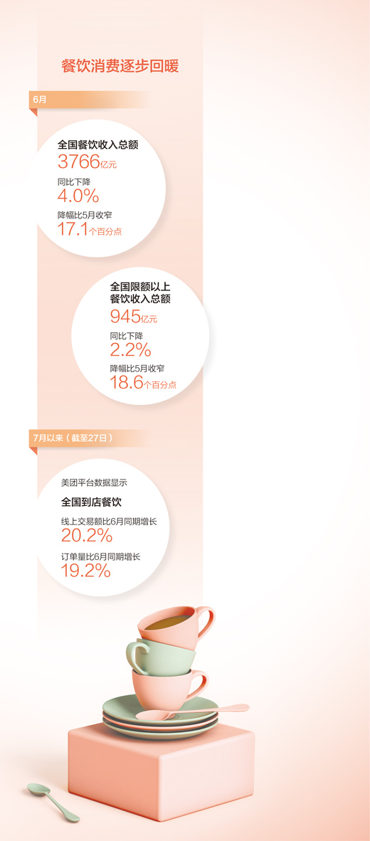 相关平台数据显示,7月以来,全国到店餐饮线上交易额比6月同期增长20.2%