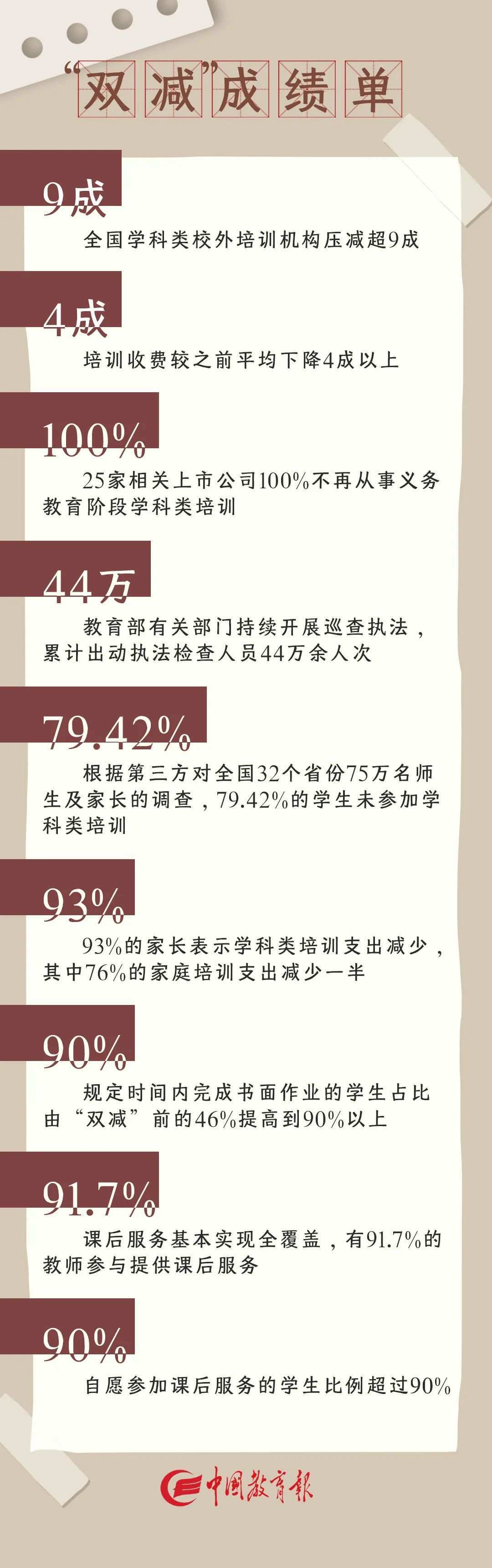 近期,据教育部有关部门提供的数据,根据第三方对全国32个省份75万名师生及家长的调查,79.42%的学生未参加学科类培训,93%的家长表示学科类培训支出减少,其中76%的家庭培训支出减少一半以上。