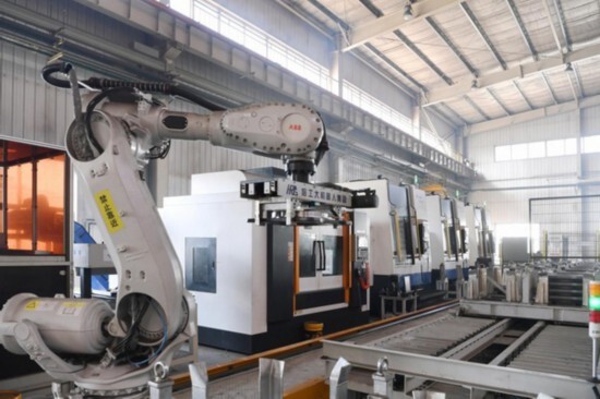 在中车齐车集团齐车公司关键配件基地,2021年投入运行的端头和上心盘智能加工生产线上,6轴机器人正在通过车削、钻削等工序进行端头加工。