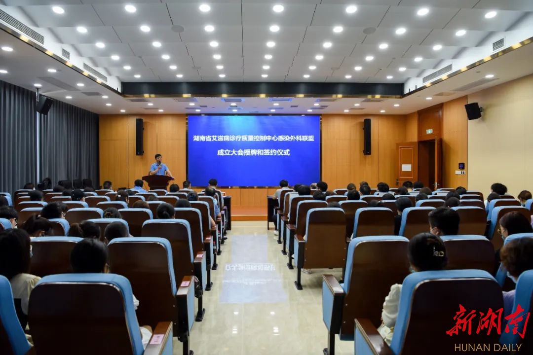 李专宣读湖南省艾滋病诊疗质量控制中心感染外科联盟成立文件,长沙市第一医院担任联盟理事长单位,衡阳市第三人民医院、郴州市第二人民医院、邵阳市中心医院、常德市皮肤病性病防治所、益阳市第四人民医院、常德市第一人民医院担任联盟副理事长单位。王东波与张强签订特聘专家协议,并为其颁发聘书。