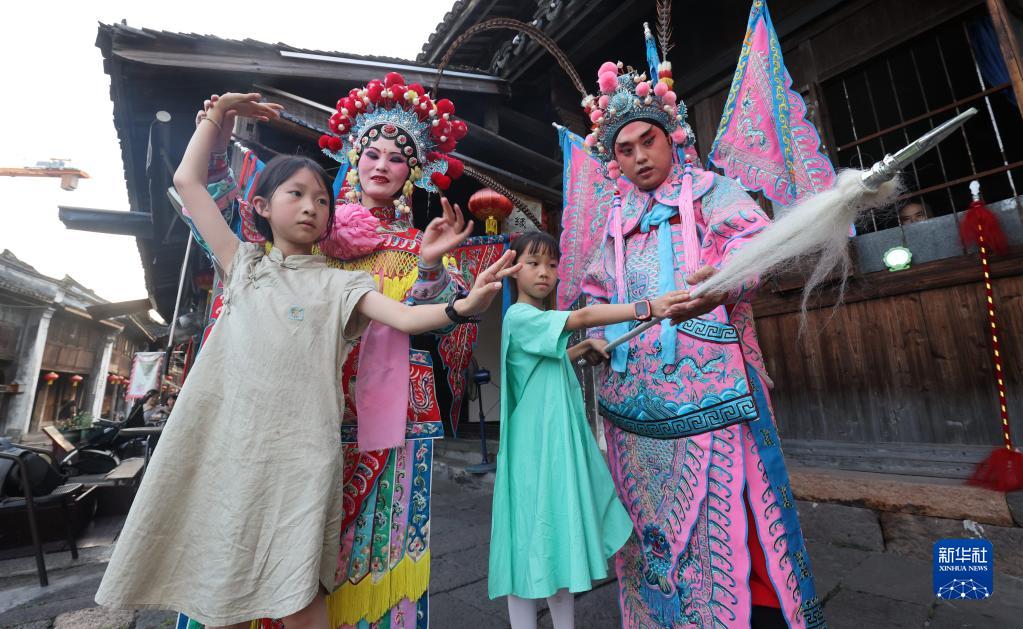 7月10日,湖州市德清县新市古镇“戏曲夜市”上,戏曲演员指导小朋友练习京剧动作。 新华社发(谢尚国摄)