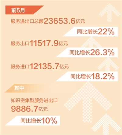 知识密集型服务贸易稳定增长。前5月,知识密集型服务进出口9886.7亿元,同比增长10%。其中,知识密集型服务出口5602.4亿元,增长13.6%;出口增长较快的领域是电信计算机和信息服务、其他商业服务,分别增长18.5%、13.2%。知识密集型服务进口4284.3亿元,增长5.6%;进口增长较快的领域是保险服务,增速达74.2%。