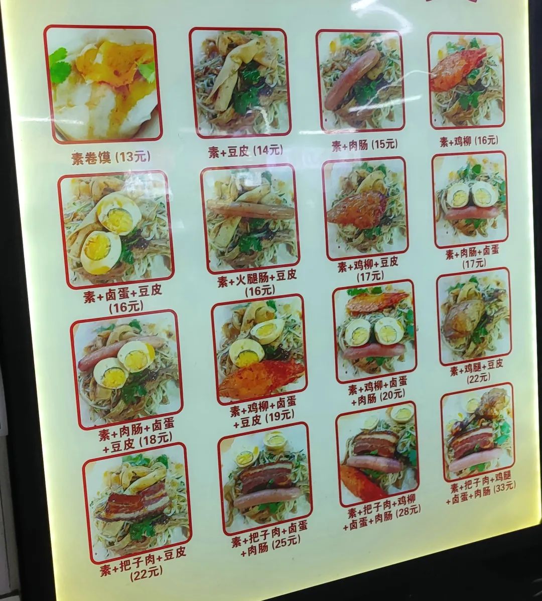 一个小档口,专门制售卷馍——一种安徽特色的小吃。小档口贴着菜单,“素+把子肉+豆皮”22元,“素+卤蛋+豆皮”16元,“素+卤蛋+烤肠+豆皮”18元。但是在外卖平台,相同配置的卷馍,分别卖36.8元、30.8元、32.8元——后两款分别有0.5元的优惠。算下来,每份卷馍,外卖都比堂食贵14.8元。尽管这个档口提供外卖满68减5的优惠,但一份卷馍很难达到68元的满减标准。