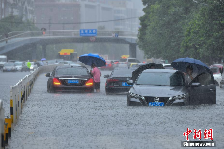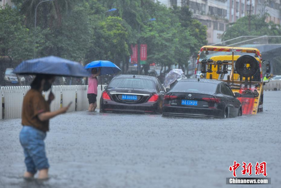 8月25日,今年第9号台风“马鞍”在广东电白沿海登陆。受其外围云系影响,海南多地出现强风雨天气,海口市气象台25日13时01分变更暴雨橙色预警信号为暴雨红色预警信号,海口市市区近3小时累积雨量已达100毫米以上。图为在海口市龙华路积水路段,多辆轿车在积水中抛锚。 骆云飞 摄