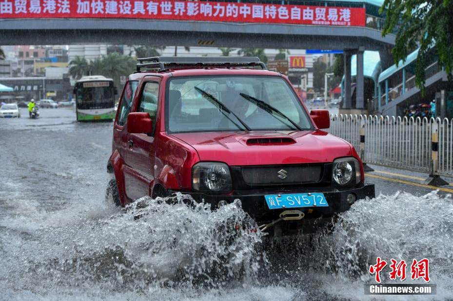图为在海口市龙华路,一辆越野车涉险通过积水路段。 骆云飞 摄