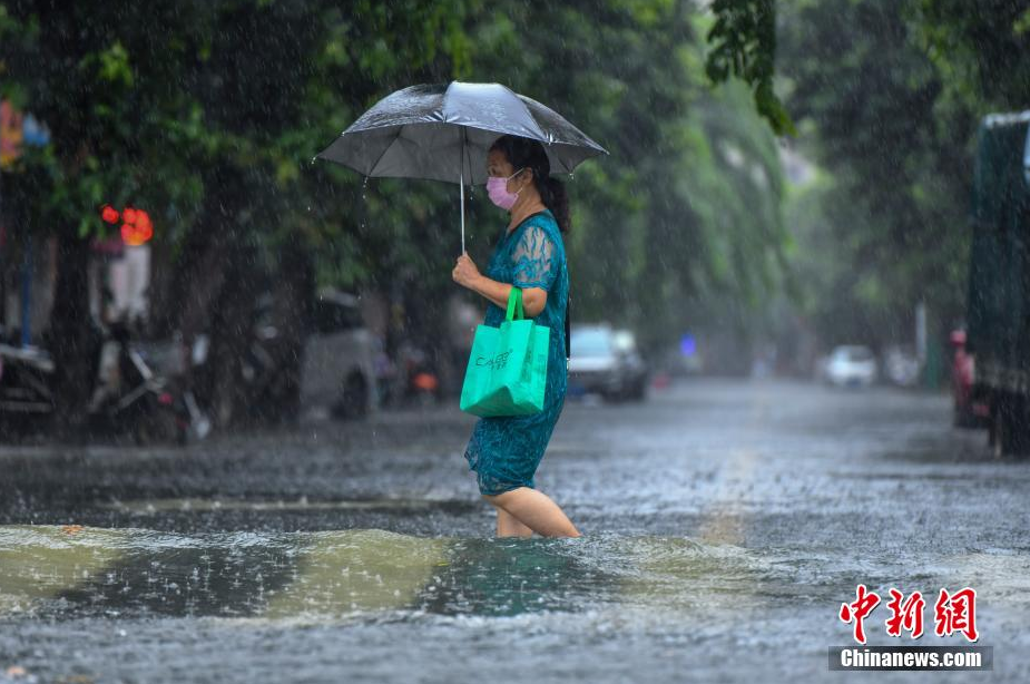 图为在海口市龙华路,市民冒雨蹚水出行。 骆云飞 摄