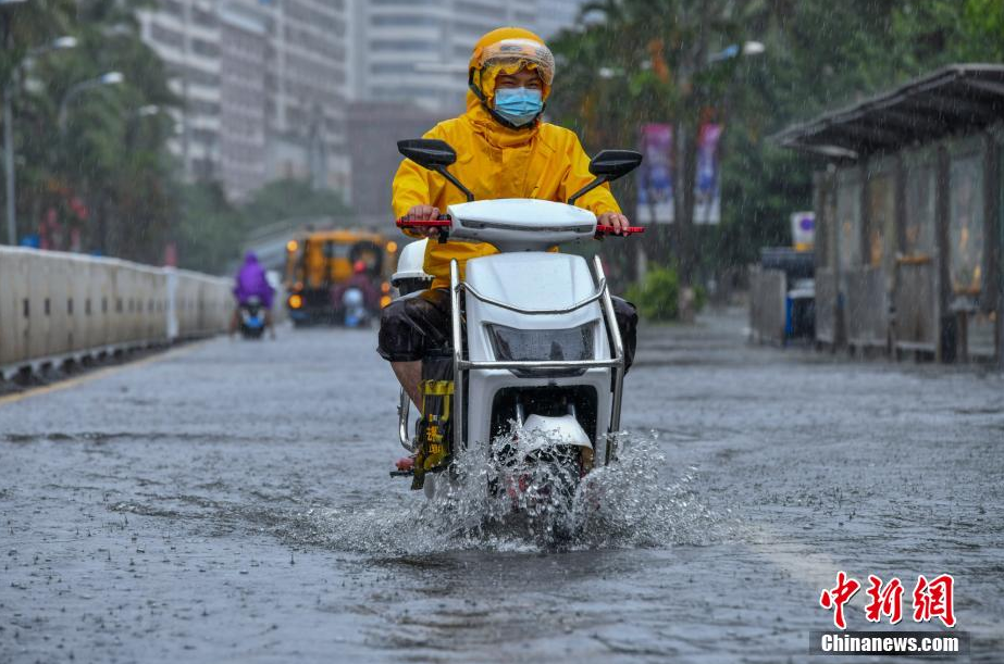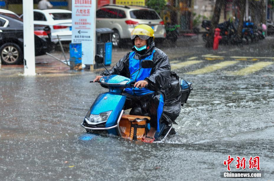 图为在海口市龙华路,一名外卖小哥通过积水路段。 骆云飞 摄