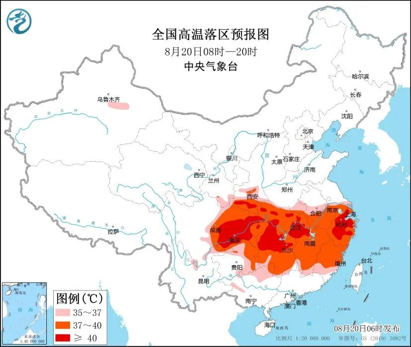 预计8月20日白天,甘肃南部、陕西南部、河南南部、安徽中南部、江苏南部、上海、湖北、湖南、江西、浙江、福建、四川中东部、重庆、贵州东部和北部、云南东北部、广西北部等地有35~39℃高温天气,其中,陕西南部、四川东部、重庆、湖北、湖南中北部、江西西北部、浙江等地的部分地区最高气温可达40℃以上。