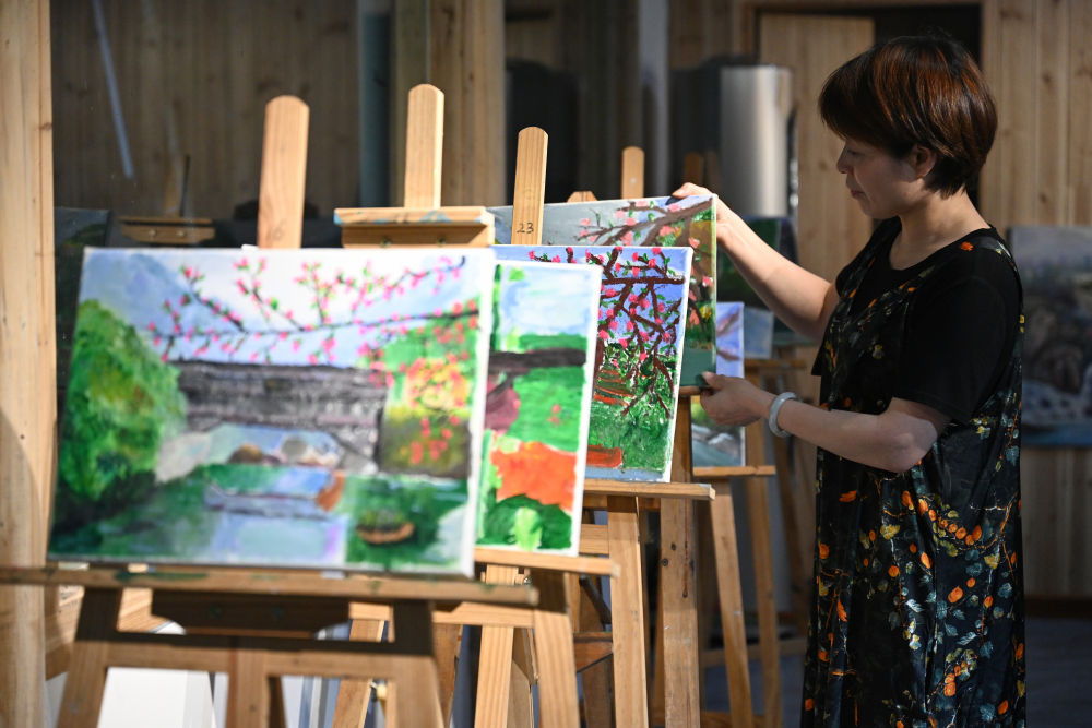↑2022年6月23日,吴祥芳在下党村下党画苑摆放画作。吴祥芳从外地来到下党村创业,她的作品主要描绘下党村的发展变化,经营的画苑年营收超过10万元。